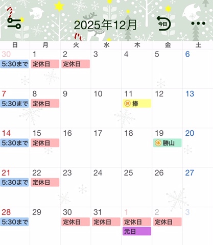 定休日 毎週月曜日 スタッフのお休み 勝山 6日、28日 捧 7日 太田 11日 横山 12日 ※12/31~1/2はお休みさせて頂きます 1/3(月)は五時半まで、1/4(火)~通常営業となります 1/18(火)は...